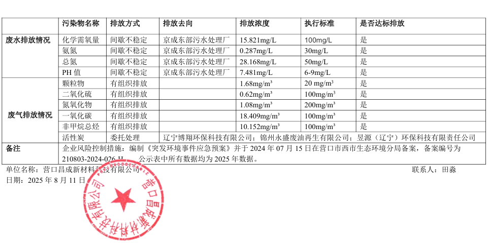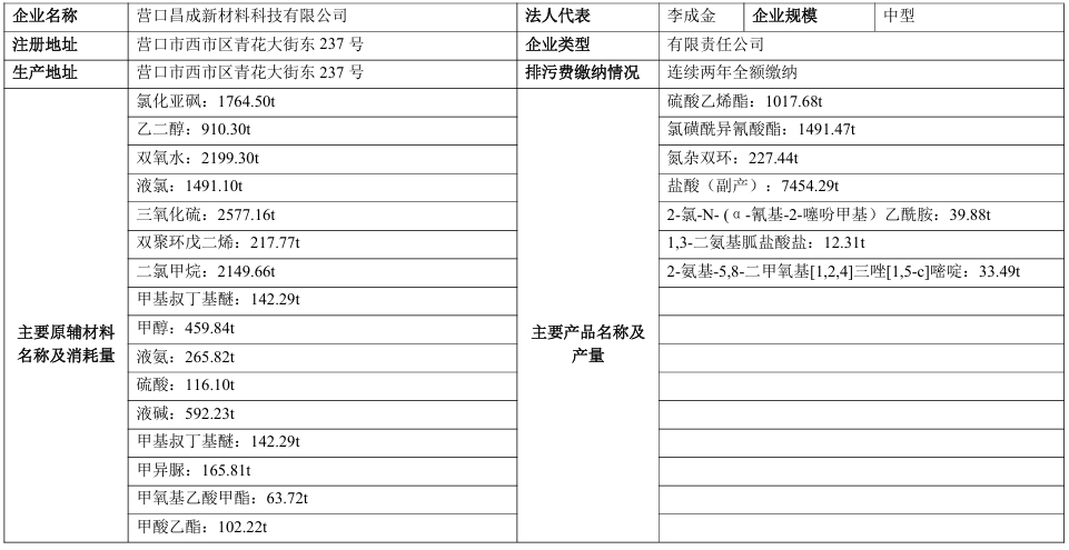 营口昌成新材料科技有限公司清洁生产信息公示